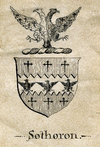 NOTES: Burke records the above Arms Crest as authentic for the family name Sothoron (Sotheron), who settled in the East and West of County York for more than two centuries. Admiral Frank Sothoron of Kirklington eldest Son of William Sothoron Esq. of Darrington left an only daughter and heir. Lucy married Thomas Suton Bucknell Estcourt Esq. who assumed the name and Arms of Sothoron.
