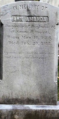 IN MEMORY OF ANN AMANDA Daughter of Benjamin W. & Susan R. Morris. Born Mar. 10, 1826. Died Feb. 20, 1913.