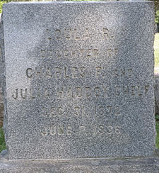 - Lula Rebecca Chelf, 63 year 5 month 7 day old single white female, life-time resident of East St., Culpeper, Culpeper Co., VA, born 31 Dec 1872 in Culpeper, VA to Charles Fielding Chelf & Julia Ann Haddox (both born in Rappahannock Co., VA), died 7 June 1936 at 5:30 A.M. in Culpeper, Culpeper Co., VA. Informant was Dr. H.T. Chelf. - Cause of death was pneumonia, based on symptoms. Certified by H.T. Chelf, M.D. of Culpeper, VA, who was in attendance from 4 June 1936 to day of death, last seeing her alive on the 6th of June. - Arrangements were by Reagner Funeral Home, Culpeper, VA. Burial was in Culpeper, VA on 9 June 1936. (Certificate of Death, Commonwealth of Virginia, Registration District No. 2230, Registered No. 18, State File No. 18126)