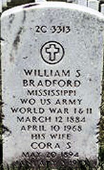 WILLIAM S. BRADFORD MISSISSIPPI WO US ARMY WORLD WAR I & II MARCH 12, 1884 APRIL 10, 1968 HIS WIFE CORA S. MAY 20, 1894 JAN. 3, 1973