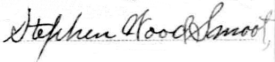 Stephen Wood Smoot of 3021 N. St. NW, Washington, DC registered for the draft at Precinct 7, Washington, DC on 5 June 1917. He was 24 years old, born 17 Jan 1893 at Darnestown, MD, single, Caucasian, with no military experience. Occupation hardware clerk for W.T. & F.B. Weaver, Washington, DC. Exemption: "no except that younger brother & self are sole support of father, mother & brother." Described as tall, slender, gray eyes, dk, brown hair, no impairments. Form 1118, No. Z-1010. (Ancestry.com* - image of World War I Draft Registration Card) Signature on card: