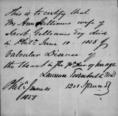 ** From www.findagrave.com: Jacob Gilliams Birth: 1783 Death: 1868 Registry no. 13052 Jacob Gilliams,M.D. age 85 yrs. Date of Interment Feby. 6/68 Location of Grave in lot 3 north (no date of removal or place of removal) (in corner Removed to Lawnview Lawn----Broad Sec. 36 Graves 89-90-91-92. Date removed 8-10-56. New Title Issued) - Burial: Monument Cemetery (Defunct), Philadelphia, Philadelphia Co., PA.