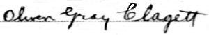 Oliver Gray Clagett of Little Lot, Hickman Co., TN registered for the draft on 12 Sept 1918, at Centreville, TN. He was 39, born 9 May 1879, White, native born. Occupation Farming, self-employed. Nearest relative was J. H. Clagett, Little Lot, Hickman Co., Tenn. Described as medium height & build, blue & brown eyes, gray hair. Noted to be Deaf & dumb. Serial No. 566, Order No. 568. (Ancestry.com* - image of World War I Draft Registration Card) Signature on card: