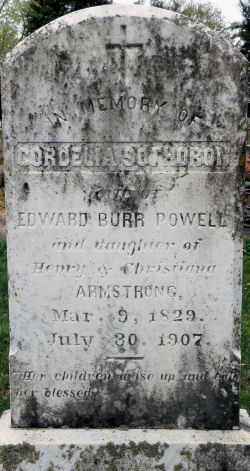 IN MEMORY OF CORDELIA SOTHORON wife of EDWARD BURR POWELL and daughter of Henry & Christiana ARMSTRONG Mar. 9, 1829. July 30, 1907. Her children rise up and call her blessed.