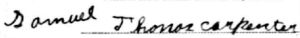 Samuel Thomas Carpenter of Fairview, MO registered for the draft at Cloverdale, Newton Co., MO on 5 June [1917]. He was 21, born 3 Sept 1895 at Pioneer, MO, single, Caucasian. Occupation self-employed farmer at Newton Co., MO. No dependants; claimed exemption for "Need me at home." Described as short, medium build, blue eyes, dark brown hair, not bald, no impairments. Reg No. 21. (Ancestry.com* - image of World War I Draft Registration Card) Signature on card: