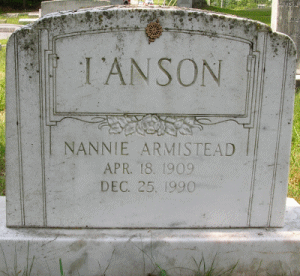 I'ANSON, Nannie Armistead, 18 Apr 1909 - 25 Dec 1990. Buried at All Faith Episcopal, St. Mary's Co., MD. (Tice* :302)