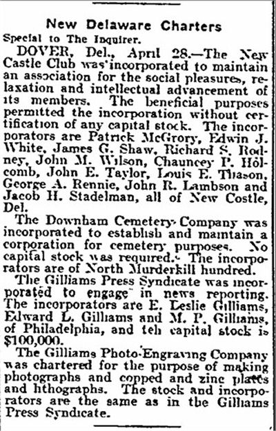 1910 Federal Census (1910.04.15, Recorded 1910.04.16) 6019 Germantown Ave., Ward 22, Philadelphia, Philadelphia Co., PA - ED 410, Sh 16(162)A, Ln 12, 320/334 - Gilliams, Leslie E. Head, 42 year old white male, in this his first marriage 21 years. He & father born in Pennsylvania, mother in New Jersey. Can read & write, speaks English. Occupation Newspaper Publisher (Employer). Renting his non-farm home. -----, Mary. Wife, 42 year old white female, in this her first marriage 21 years. Had 3 children, all living. Born in Pennsylvania, parents in Delaware. Can read & write, speaks English. Occupation None. -----, Edward L. Son, 19 year old single white male. He & parents born in Pennsylvania. Can read & write, speaks English. Occupation Newspaper at Publishing House, drawing wages. -----, Thomas F. Son, 18 year old single white male. He & parents born in Pennsylvania. Can read & write, speaks English, attended school since Sept. Occupation None. -----, Janice M. Daughter, 8 year old white female, attended school since Sept. She & parents born in Pennsylvania. Occupation None. -----, John J. Father, 79 year old widowed white male. He & parents born in Pennsylvania. Can read & write, speaks English. Occupation None. - (2 Servants)