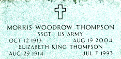 MORRIS WOODROW THOMPSON SSGT US ARMY OCT 12 1913 . . . AUG 19 2004 ELIZABETH KING THOMPSON AUG 29 1914 . . . JUL 7 1993