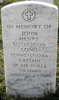 IN MEMORY OF JOHN HENRY SOTHORON LONG PENNSYLVANIA CAPTAIN US AIR FORCE VIETNAM JANUARY 29, 1940 JULY 18, 1973 DFC--AM & 3 OLC PH