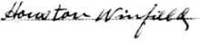 Houston Winfield of Linton, Trigg Co., KY registered for the draft at Trigg, KY on 12 Sept 1918. He was White, 45 years old, born 12 June 1873 in USA. Occupation Blacksmith/Farmer at same address. Nearest relative was Mary Winfield of same address. Described as of medium height & build, black eyes, black hair, no impairments noted. Serial No. 1409, Order No. 938. (Ancestry.com* - image of World War I Draft Registration Card) Signature on card:
