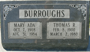 Thomas R. Burroughs, b. 8 Feb 1900, d. 2 Mar 1980, husband of Mry Ada Burroughs; same stone. Buried at St. Joseph's Catholic (New), Morganza, St. Mary's Co., MD. (Tice* :89)