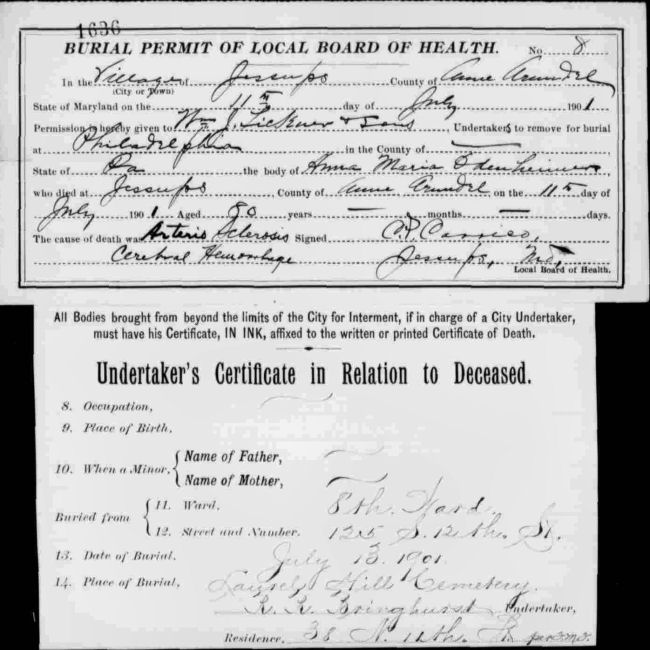 Gilliams Anna Maria [Female] b. JAN 1821 Pennsylvania - d. 11 JUL 1901 Jessups, Anne Arundel Co., MD