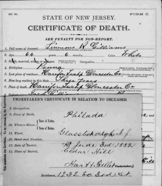 John Willie Gilliams, 12 years & 3 months of age, white, born in Pennsylvania, last living in Harrison Twp., Gloucester Co., resident of state for 8 years, died in Harrison Twp., Gloucester Co. on 31 Aug 1886 from "Shock (struck in the abdomen by a horse)," 7 hours prior to death. Father was John C. Gilliams & mother Lavinia Gilliams, both born in Penna. Certified by John H. Asherafer. Residence Mullica Hill; undertaker was W. H. Roenemann of Elmer. Burial was at Frankford. (New Jersey Certificate of Death)