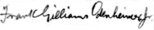 Frank Gilliams Odenheimer, Jr. of 188 East Capital, Washington, DC registered for the draft at Pct. 9, Washington, DC on 5 June 1917. He was Caucasian, married with a child, 26 years old, born 28 July 1890 in Philadelphia, PA. Occupation Clerk, Correspondence with Tabulating Machine Co., Washington, DC. Claimed exemption for support of wife & child. Described as of medium height, stout build, light blue eyes, dark brown hair, not bald & no impairments. Form 1633, Card 819. (Ancestry.com* - image of World War I Draft Registration Card) Signature on card:
