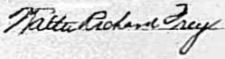 Walter Richard Frey of 4005 Hawthorne Ave., Balto., Md. applied for the draft at Local Board 15, Baltimore, MD on 17 Sept 1918. He was White, 34 years old, born 13 July 1884 in USA. Occupation "Coal Business" with Oneida Coal Cl., Md. Trust Bldg., Balto., Md. Nearest relative was Alma R. Frey of same address. Described as tall, medium build, blue eyes, grey black hair, no impairments. Serial No. 1765, Order No. a1248. (Ancestry.com* - image of World War I Draft Registration Card) Signature on card: