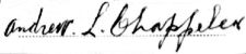 1920 Federal Census (1920.01.01, Recorded 1920.01.12) 909 Kent Place, N.W., Pct. 9, Washington, DC - ED 226, Sh 12(29)A, Ln 12, 214/145 - Chappeler, Andrew L. Head, 36 year old married white male, has a mortgage on his home. Can read & write, speaks English. He & parents born in Maryland. Occupation Chauffeur for Alexandria(?), drawing wages. -----, Winnie E. Wife, 24 year old married white female. Can read & write, speaks English. Born in Virginia, parents in Ireland. Occupation None. -----, Leroy A. Son, 4 11/12 year old white male. He & mother born in Virginia, father in Maryland. -----, Adrion L. Son, 3 7/12 year old white male. Born in DC, father in Maryland, mother in Virginia. - Lonergan, Dolly. Sister-in-law, 26 year old single white female. Can read & write, speaks English. Born in Virginia, parents in Ireland. Occupation Printer's Asst. at Bureau P & E, drawing wages. - (3 boarders) Andrew L. Chappelear et ux Winnie E. convey to Benjamin Hoffman et ux Blanche the property at 909 Kent Place Northwest, square 931, lot 19. (Ancestry.com* - image of The Legal Record in The Washington Post of 23 April 1920) See brother William's Notes for 1930 Federal Census entry. Andrew Leroy Chappelear of Hughesville, Charles Co., MD registered for the draft. He was 60 years old, born 30 Jan 1882 in St. Mary's Co., MD. Was self-employed at same address. Telephone number was Mech. 54712. Occupation Self-Employed. Person knowing his location was Mrs. Eltreida M. Chappelear of same address. (Ancestry.com* - image of front of World War II Draft Registration Card) Signature on card: