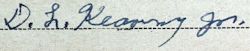 Davie Lee Kearney, Jr. of 109 1/2 Broad, Oxford, N.C. registered for the draft at Local Board 1, Oxford, N.C. on 16 Feb 1942. He had no phone, was 21 years old, born 30 July 1920 in Oxford, N.C. Person knowing his whereabouts was Mrs. D.L. Kearney of same address. Employer "none." Described as White, 5' 11" tall, 148 pounds, blue eyes, red hair, light complexion, no impairments. Serial No. 457, Order No. 10579. (Ancestry.com* - image of World War I Draft Registration Card) Signature on card: