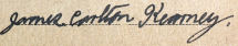 James Carlton Kearney of 109 1/2 Broad St., Oxford, Granville Co., NC registered for the draft at Local Board 1, Oxford, Granville Co., NC on 11 Dec 1942. He had no phone, was born 24 July 1924 in Oxford, N.C. Person always knowing his whereabouts was Mrs. Hallie Kearney of same address. Employed by John C. Wormack of Camp Breton(?), Central Fire Station, No. 3. Described as White, 5' 11" tall, 166 pounds, blue eyes, brown hair, light complexion no impairments. Serial No W-21, Order No. 12, 317. (Ancestry.com* - image of World War I Draft Registration Card) Signature on card: