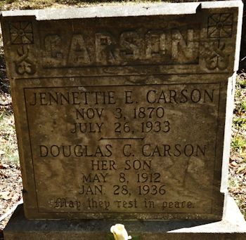 C A R S O N JENNETTIE E. CARSON NOV. 3, 1870 JULY 26, 1933 - - - - - - - - - DOUGLAS C. CARSON HER SON MAY 8, 1912 JAN. 28, 1936 May they rest in peace.