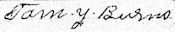 Thomas Young Burns of RFD #1, Waterloo, Lauderdale Co., Ala. registered for the draft at local board on 12 Sept 1918. He was White, 35 years old, born 10 Oct 1882 in USA. Occupation self-employed Farming. Nearest relative was Julie Burns of same address. Described as tall, of medium build, brown eyes & hair, no impairments. Serial No. 3657, Order No. 1570. (Ancestry.com* - image of World War I Draft Registration Card) Signature on card: