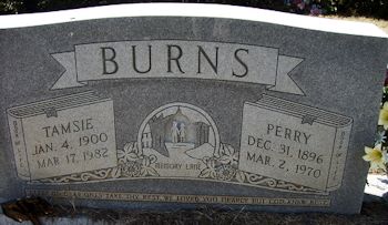 Grave Marker at Barkley Cemetery, Center Star, Lauderdale Co., AL. Full names are given as Horace Oliver Perry Burns and Tamsie Ellen Foust. (Photo & information from www.findagrave.com)