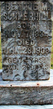 BETTIE M. SUMMERHILL BORN NOV. 7, 1834 DIED JAN. 28, 1908 AGE 74 YRS. 1 MO. 21 DAYS.