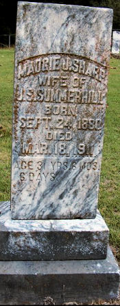 MADGIE J. SHARP WIFE OF J.S. SUMMERHILL BORN SEPT. 24, 1880 DIED MAR. 18, 1911 AGE 31 YRS. 6 MOS. 6 DAYS