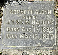 People PageHaddox Kenneth Glenn [Male] b. 17 AUG 1892 California - d. 12 MAY 1897 Savannah Cemetery, Rosemead, Los Angeles Co., CA