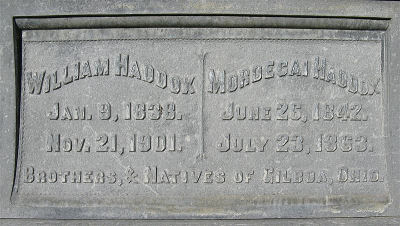 William Haddox was born on 09 Jan 1838 in Gilboa, Putnam Co Ohio. He died on 21 Nov 1901 in CA. Information for William provided by Mary Ann Powers from tombstone at Savannah Cemetery in El Monte CA.(JA)