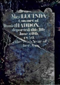 Mrs. LUCINDA Consort of Daniel HADDOX departed this life June 10, 1850 ... the 40th Year of her Age.