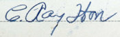 Cecil Ray Hon of 603 Fifth St., High Point, Guilford Co., NC, 35 year old born 20 Nov 1904 at DeLand, FL, registered for the draft at Local Board #5, High Point, NC on 16 Oct 1940. Employed by Logan Porter Mirror Co., East Russell at High Point, Guilford Co., NC. Person knowing his whereabouts was wife, Mrs. Cecil Ray Hon of same address. Described as White, 6' 1 1/2" tall, 145 pounds, brown eyes & hair, light complexion. No impairments noted. (Ancestry.com* - image of World War II Draft Registraion Card, Serial No. 2229, Order No. 834) Signature on card: