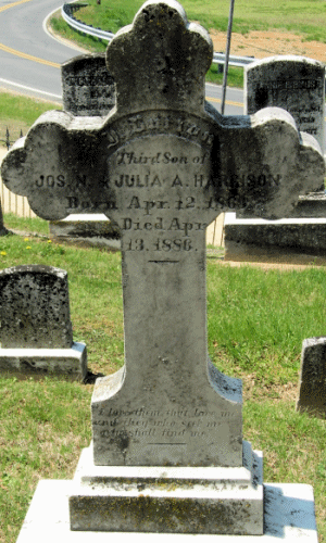 J. Burton Third Son of JOS. N. & JULIA A. HARRISON Born Apr. 12, 1863 Died Apr. 13, 1886 "I love them that love me and they who seek me early shall find me."