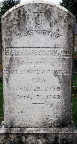 IN MEMORY OF SARAH HARRISON POWELL Daughter of CAPT. EDWARD B. POWELL C.S.A. Jan. 15, 1855 Sept. 9, 1943