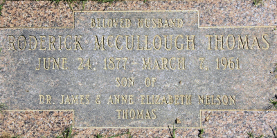 Roderick Mccullough Thomas, beloved husband; s/o Dr. James & Anne Elizabeth Nelson Thomas, b. 24 Jun 1877, d. 7 Mar 1961, buried All Faith Episcopal Church (Tice* :544)