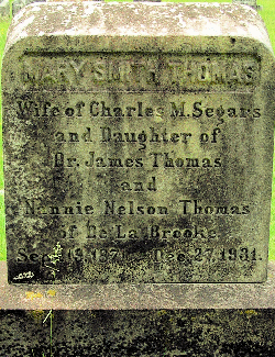 Mary Smith Thomas Segars, 19 Sep 1871 - 27 Dec 1931, Wie of Charles M. Segars; daughter of Dr. James Thomas. Buried at All Faith Episcopal. (Tice* :492)