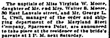 Virginia Wentworth Moore, dau Walter Scott Moore & Mary Elizabeth Shelton Gardiner, b. 18 Jan 1874, d. 3 Jan 1945, Baltimore, MD, buried Druid Ridge Cemetery, Baltimore, MD; m. George Lochman Croll, son of George Lochman Croll & Sarah Elizabeth Brown, at 30 E. Lanvale St., Baltimore, MD; he b. 13 Aug 1861, Middletown, PA, d. 20 Jan 1931, Baltimore, MD. She was Episcopalean, was educated at Maryland Institute of Art (1889). (Croll* - Diary of Mary Elizabeth Shelton Gardiner)